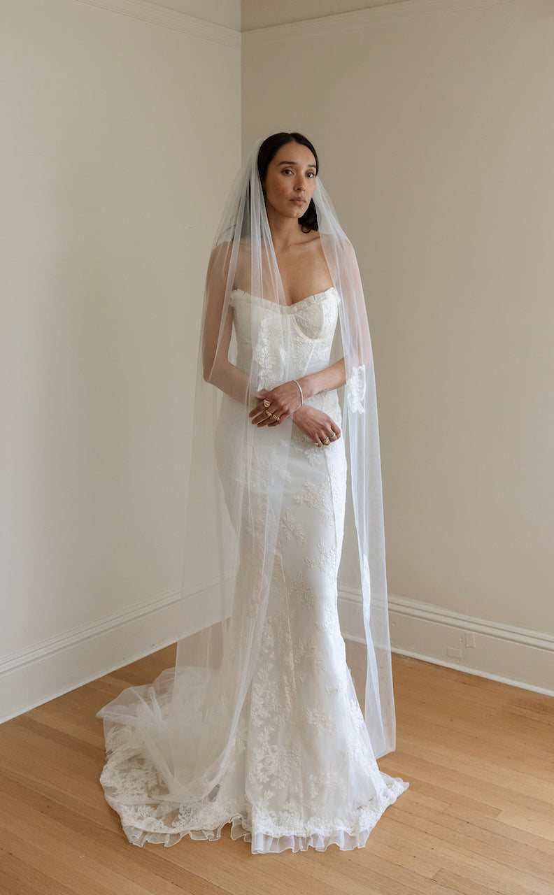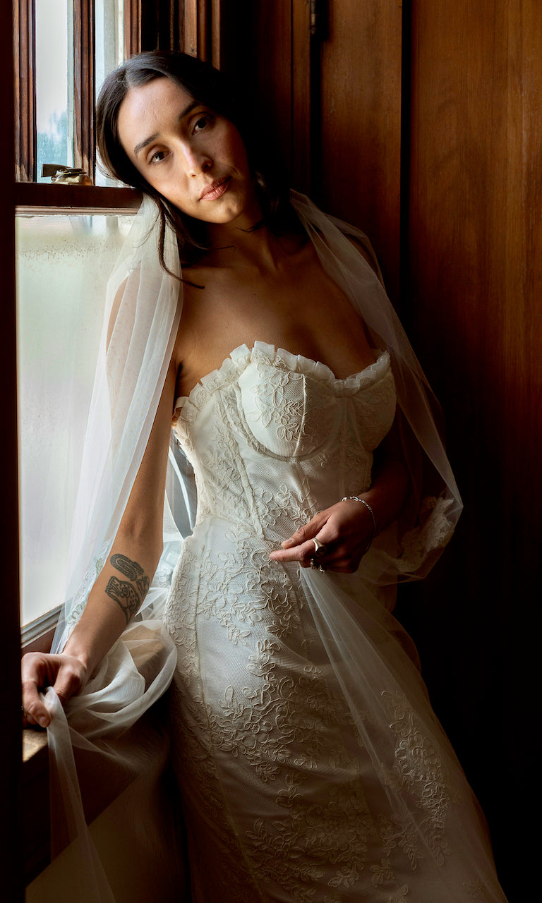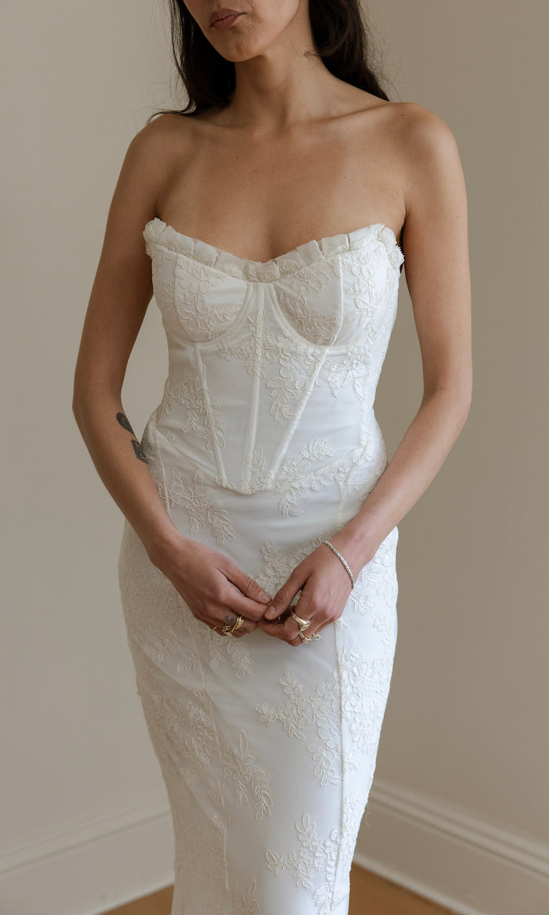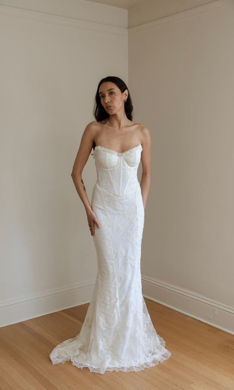 FRENCH CORDED LACE ADDS TO THE FEMININE SILHOUETTE. PLEATED LACE AND ORGANZA TRIM ON POINTED BUST. LINED IN BLUSH SATIN AND CHIFFON (ALSO AVAILABLE IN IVORY)