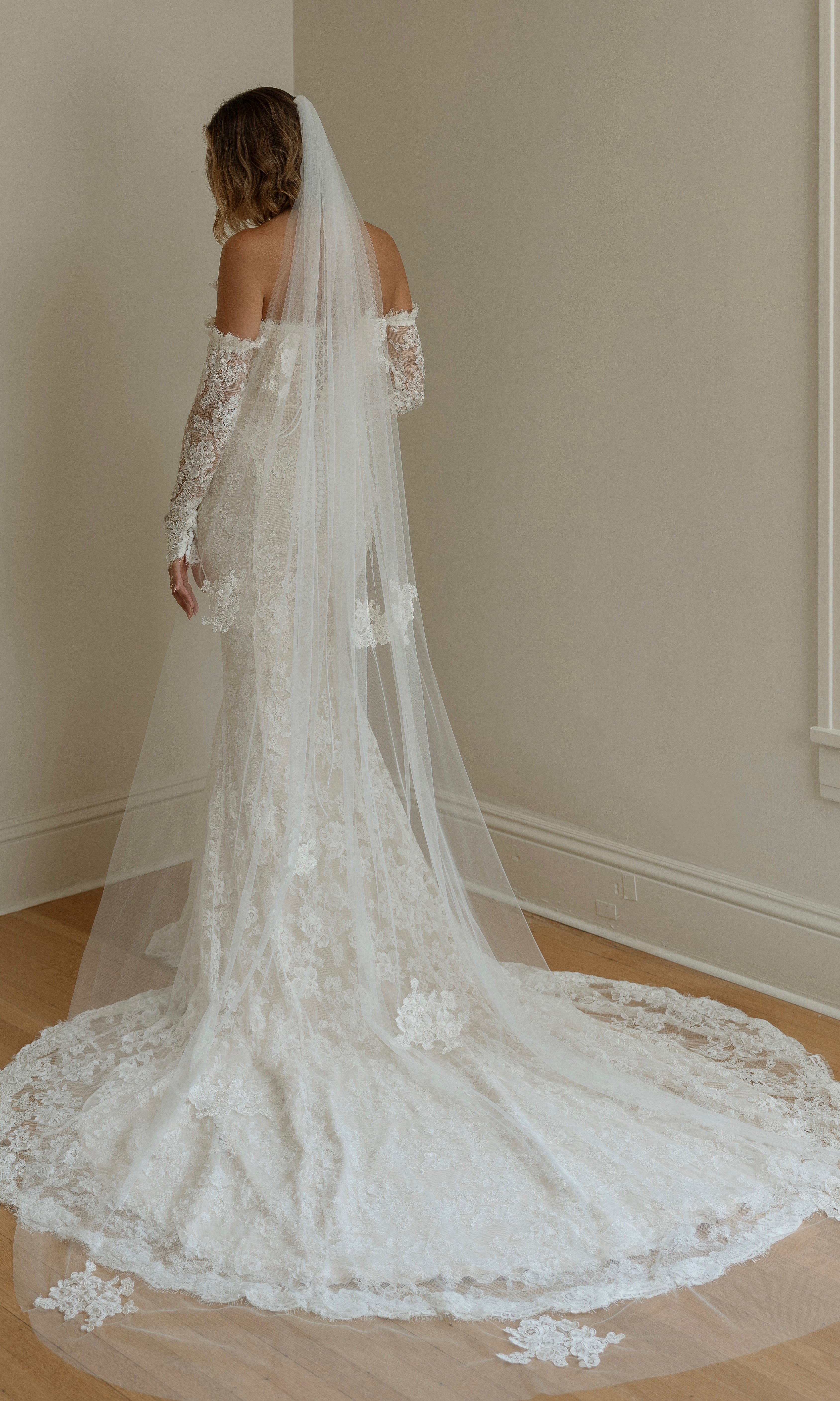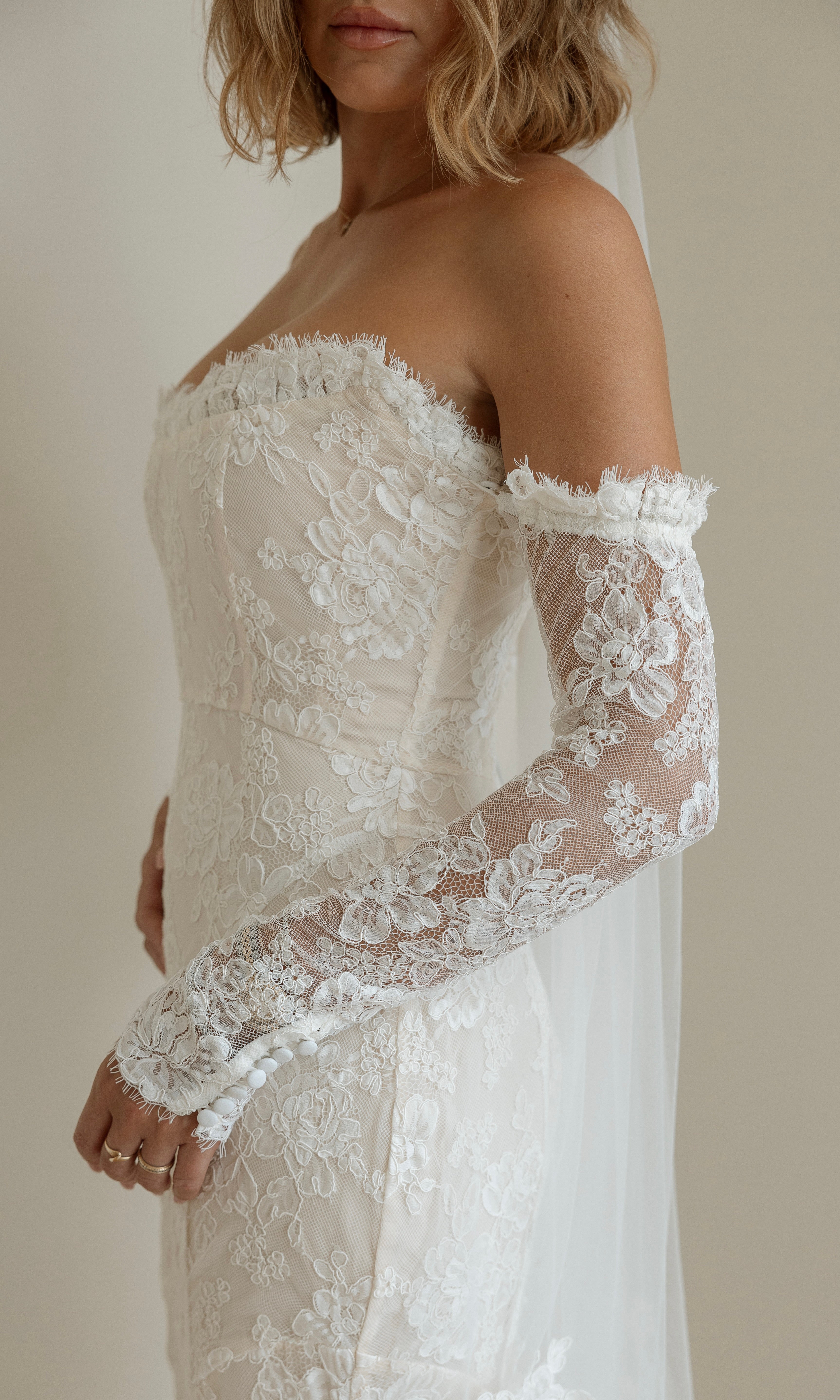 ROMANTIC FRENCH CORDED LACE BUSTIER GOWN, STRAPLESS AND FITTED BODICE WITH UNDERWIRE AND BONING. RUFFLED LACE DETAIL ALONG THE BUST, DETACHABLE LONG UNLINED SLEEVES WITH FIT AND FLARE SKIRT. ORNATE PEARL BUTTON DETAILING DOWN THE BACK, FRONT AND BACK PROMINENT PRINCESS SEAMS. FULL SKIRT FLOWS INTO AN ELONGATED TRAIN. ALSO, SEE SISTER STYLES ‘ROSS‘ & ‘LEO'.