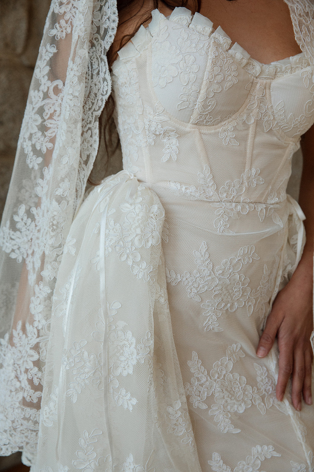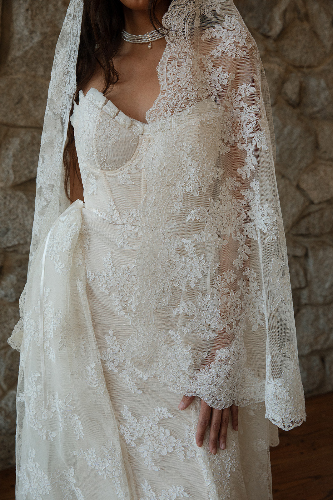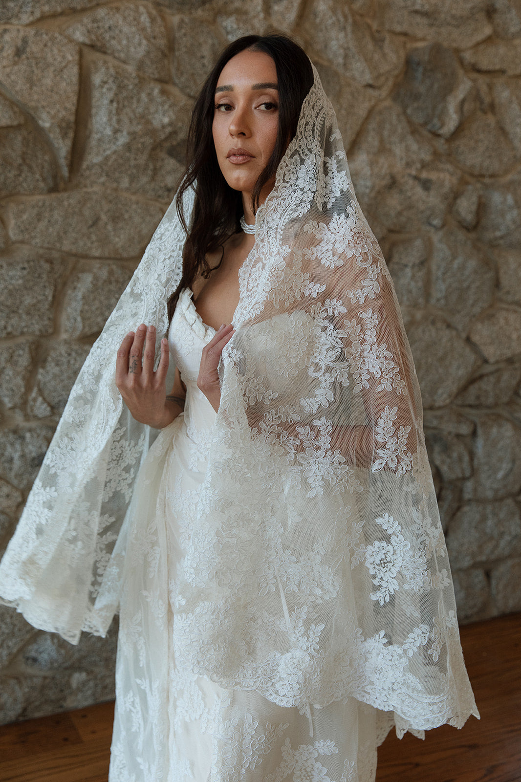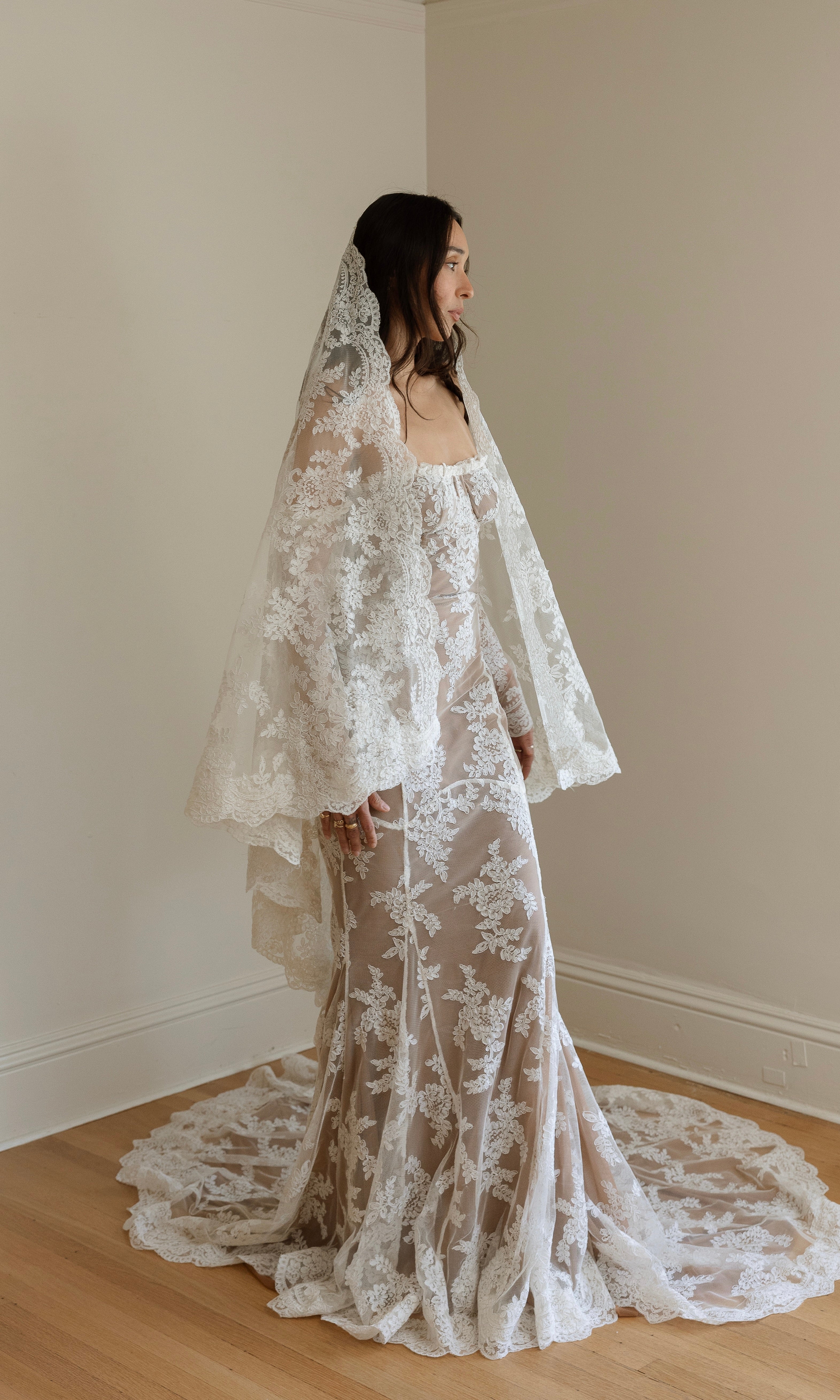 Mantilla veil cut from our 2025 french corded lace. Cascading face framing lace. Orders have a 5 week turn around from order to ship