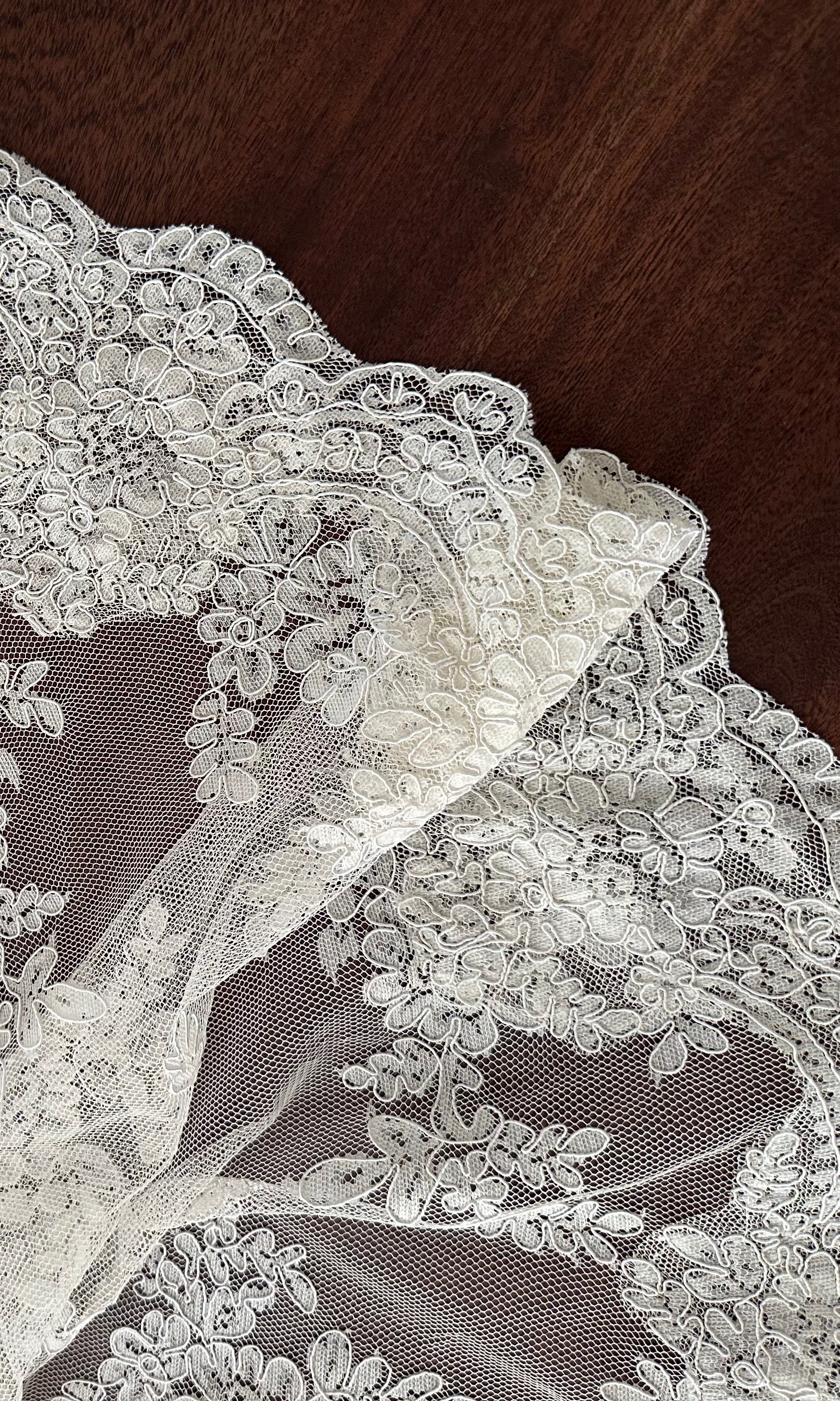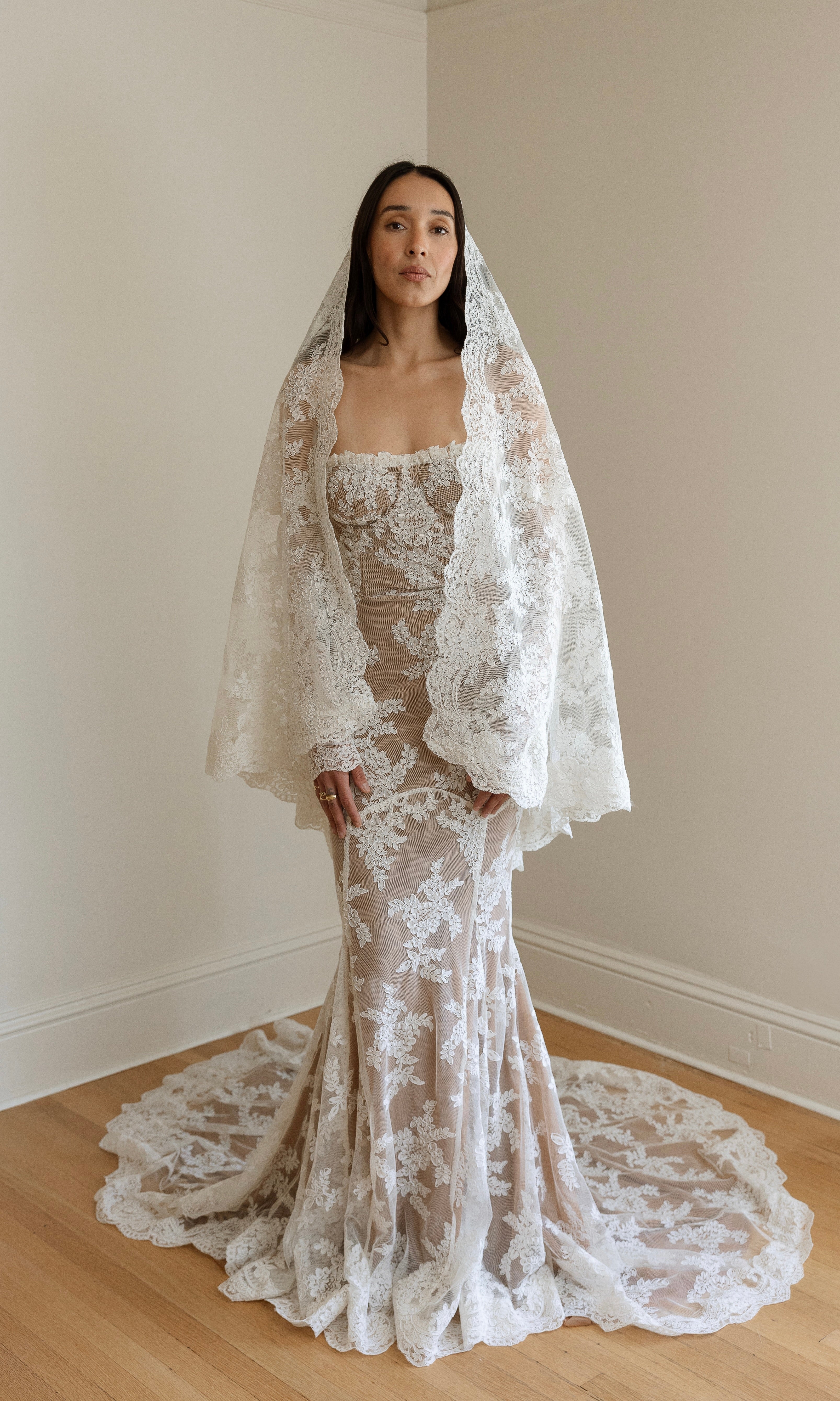 Mantilla veil cut from our 2025 french corded lace. Cascading face framing lace. Orders have a 5 week turn around from order to ship