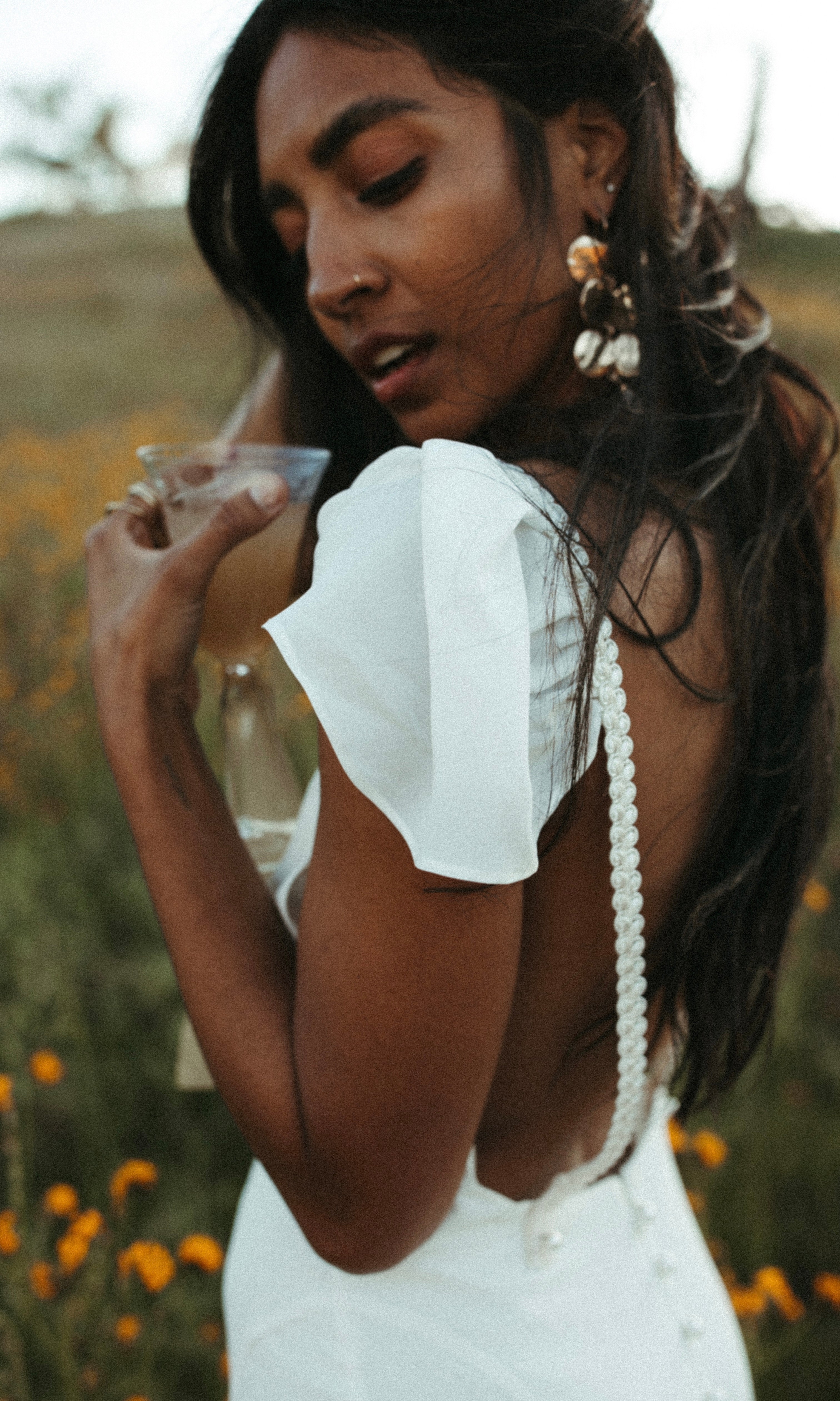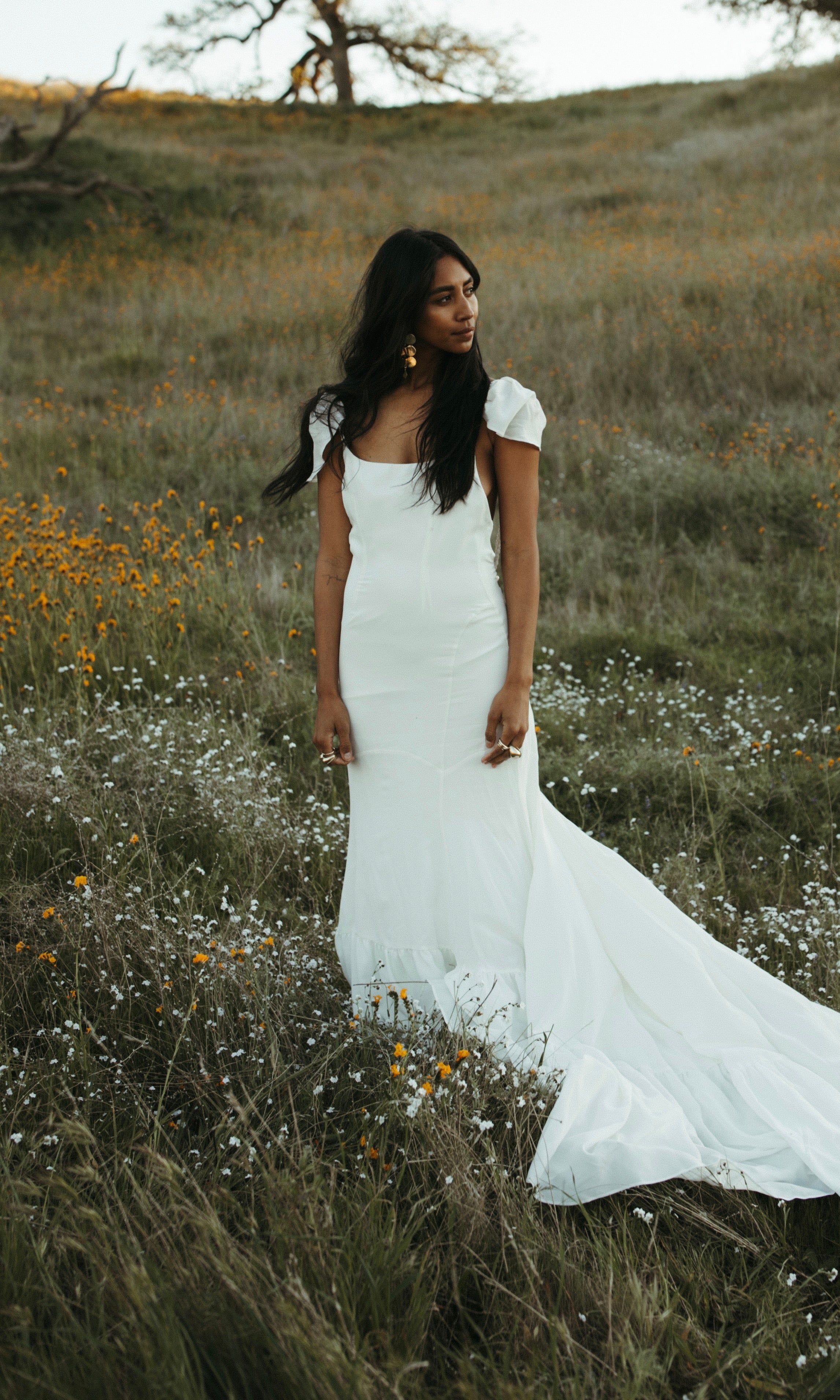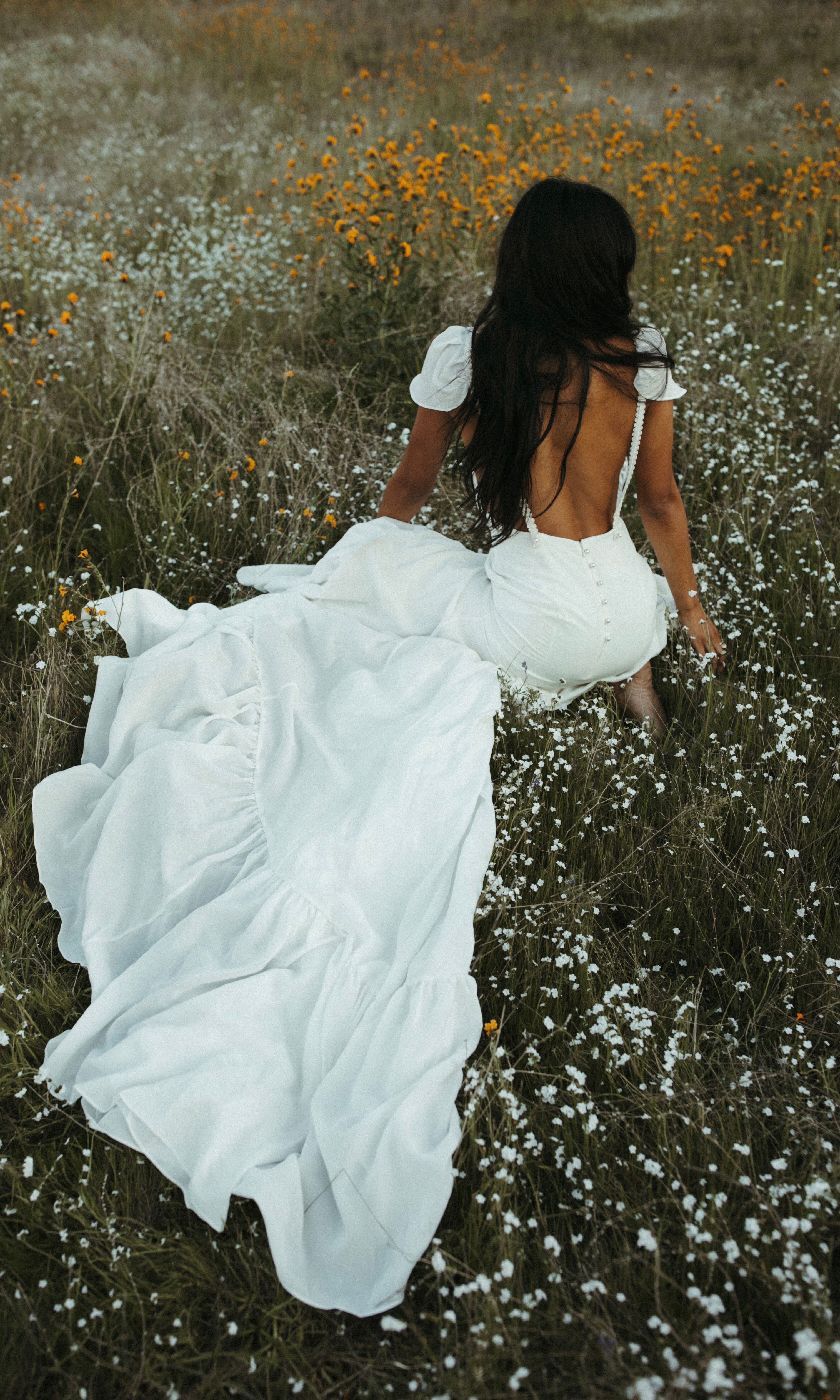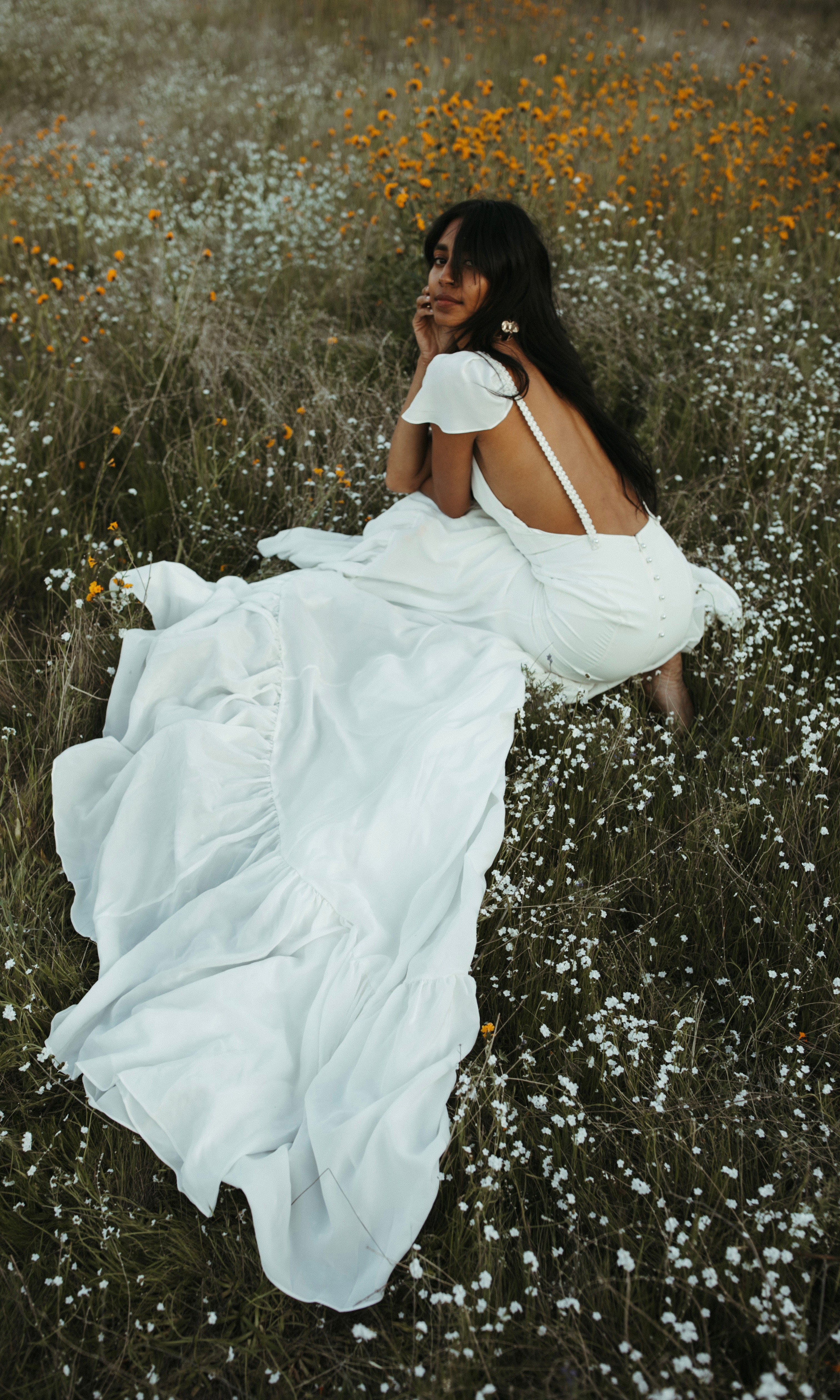 THE “STEVIE” GOWN IS POSSIBLY AS ROMANTIC AS IT GETS. THIS GOWN FEATURES A 90S SCOOP-LIKE NECK. FLATTERING SEAMS THROUGHOUT THE EMPIRE WAIST ACCENTUATE AND FLATTERS THE HIPS BEFORE CASCADING INTO A DRAMATIC ROUNDED TRAIN. THIS DRESS ALSO INCLUDES A FULLY EXPOSED BACK WITH TWO WINGS AT THE LOWER BACK (WHICH CAN BE DETACHED BY BUTTON LOOP). CHOICE OF PEARLED TULLE OR IVORY CHIFFON WINGS