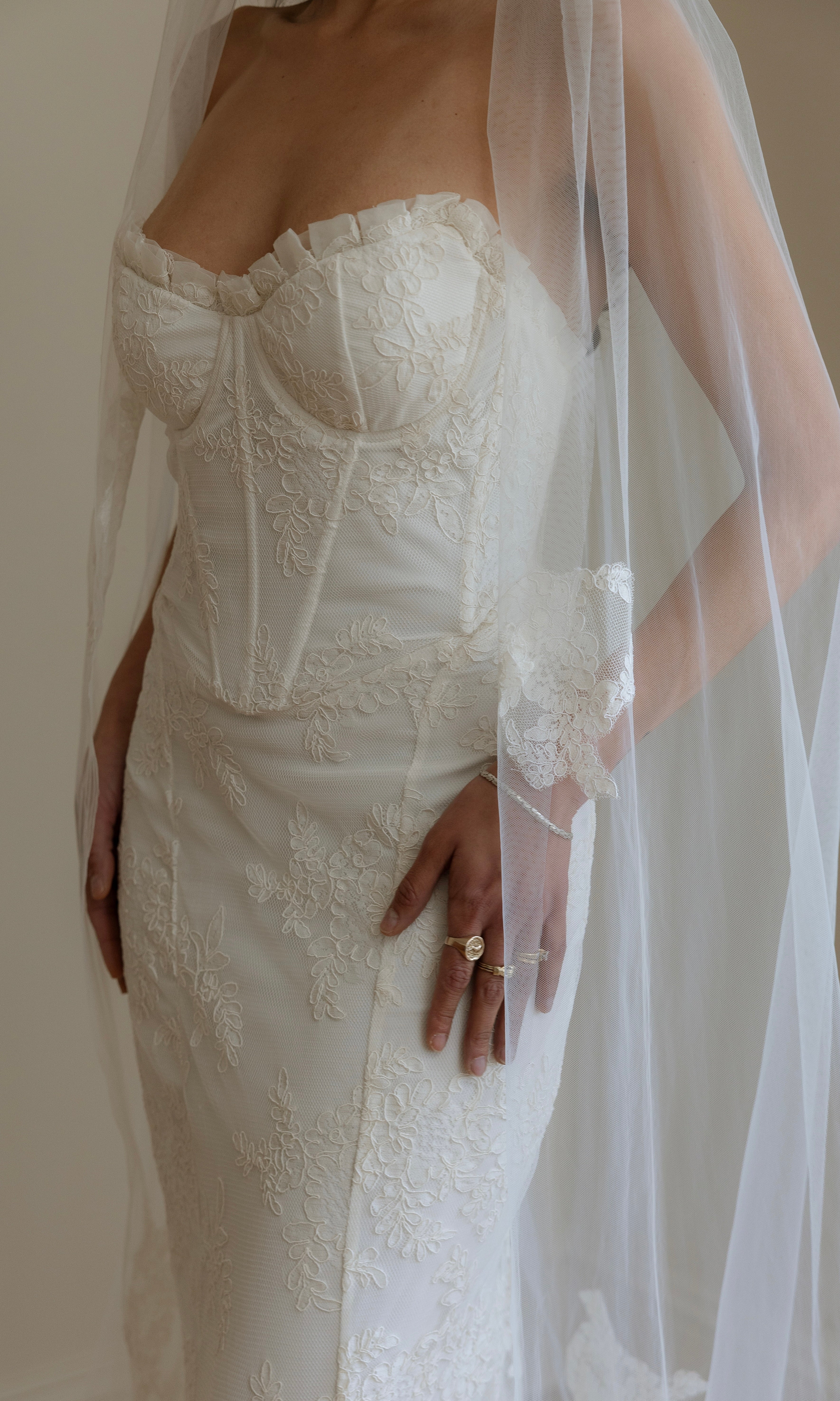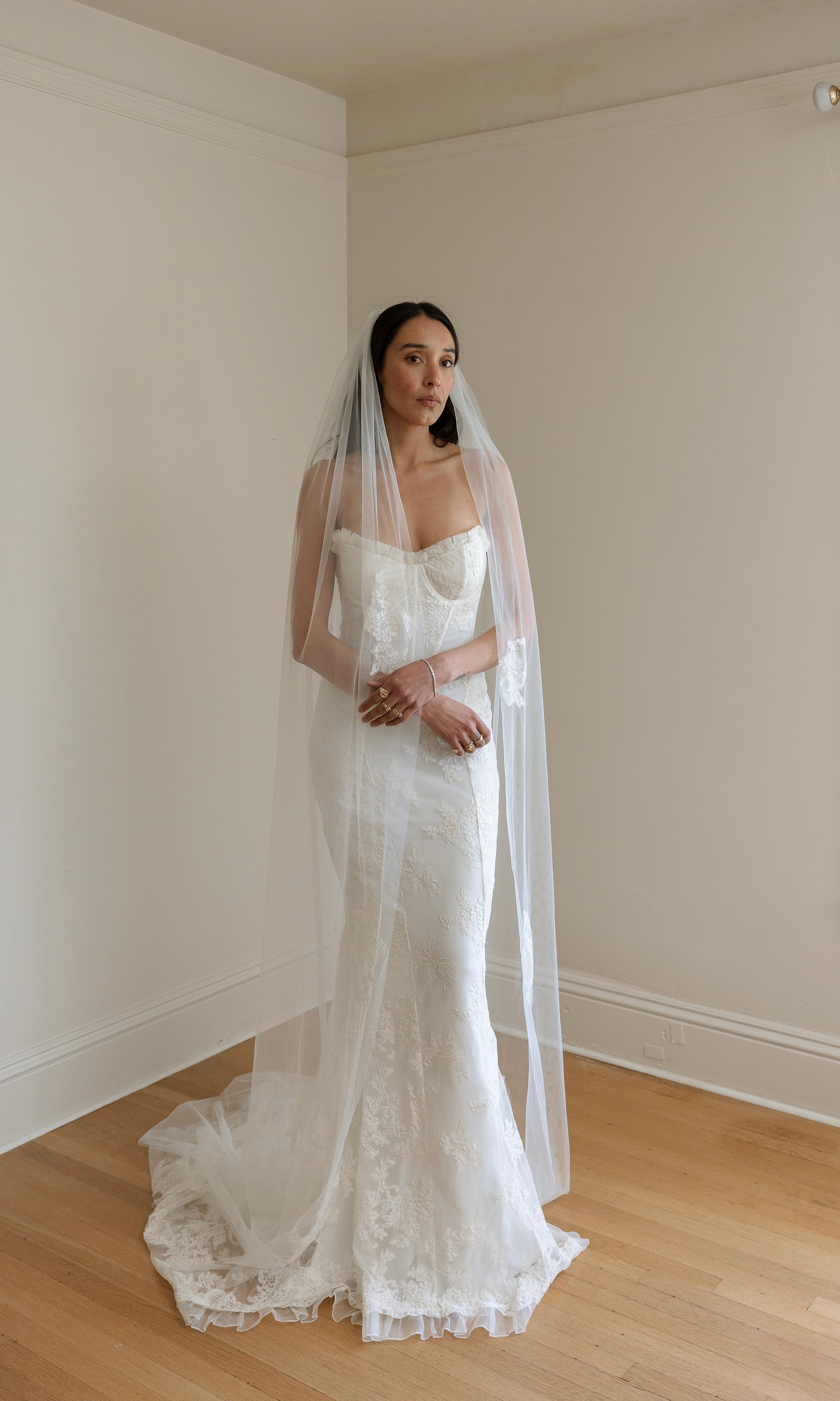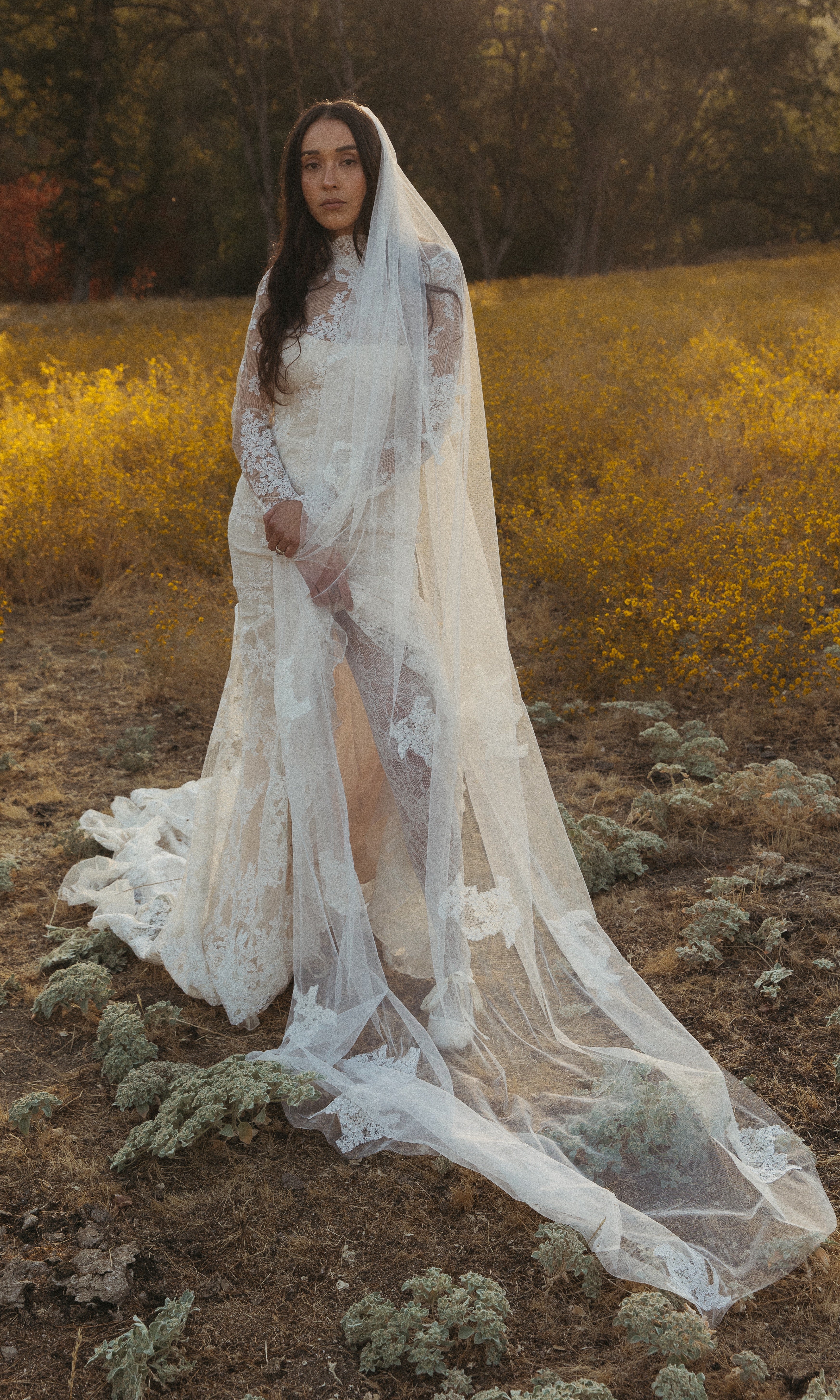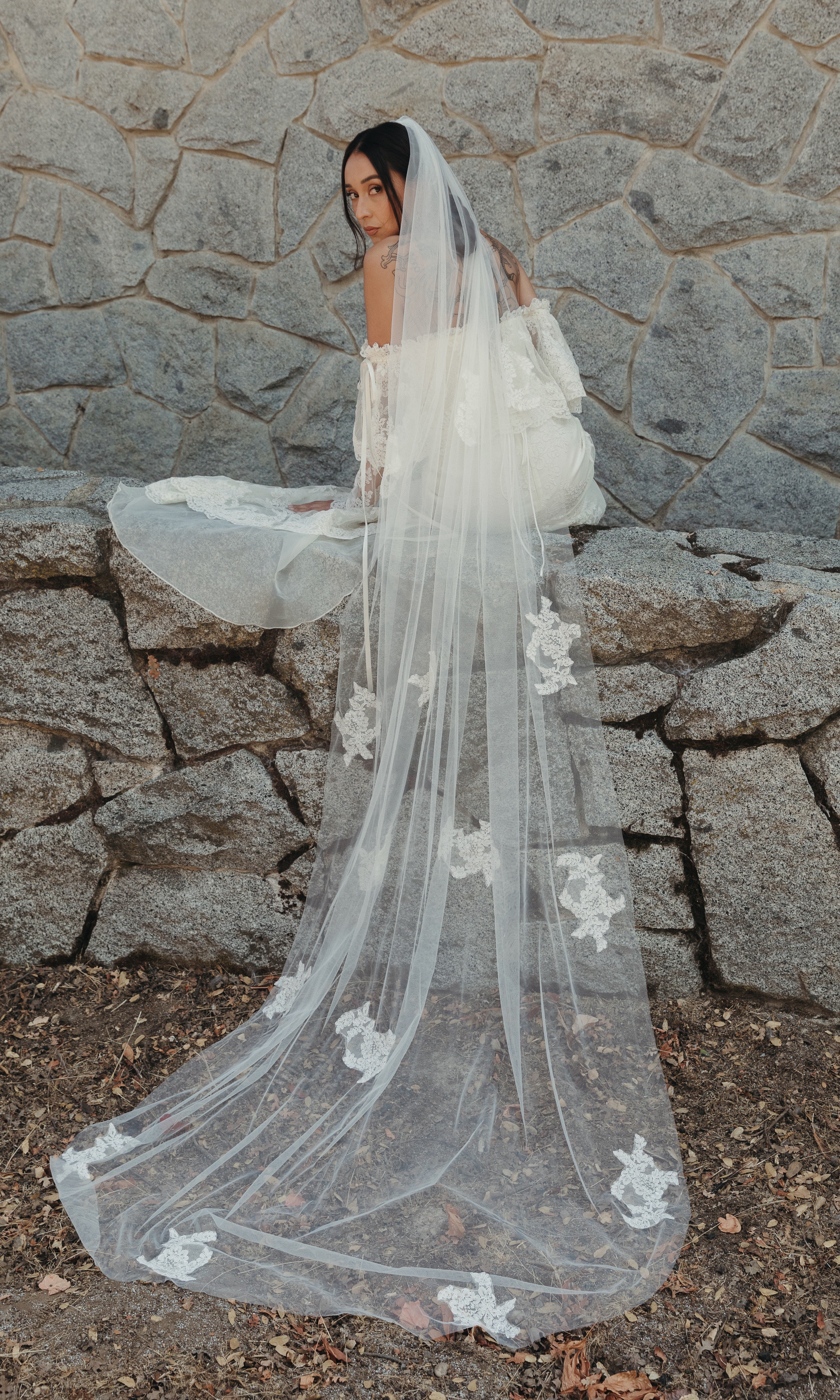 Detailed floral appliqué cut from our 2025 french corded lace. Cascading appliqué adorns the soft tulle. Now available in fingertip length (42") and cathedral length (108"). Orders have a 5 week turn around from order to ship