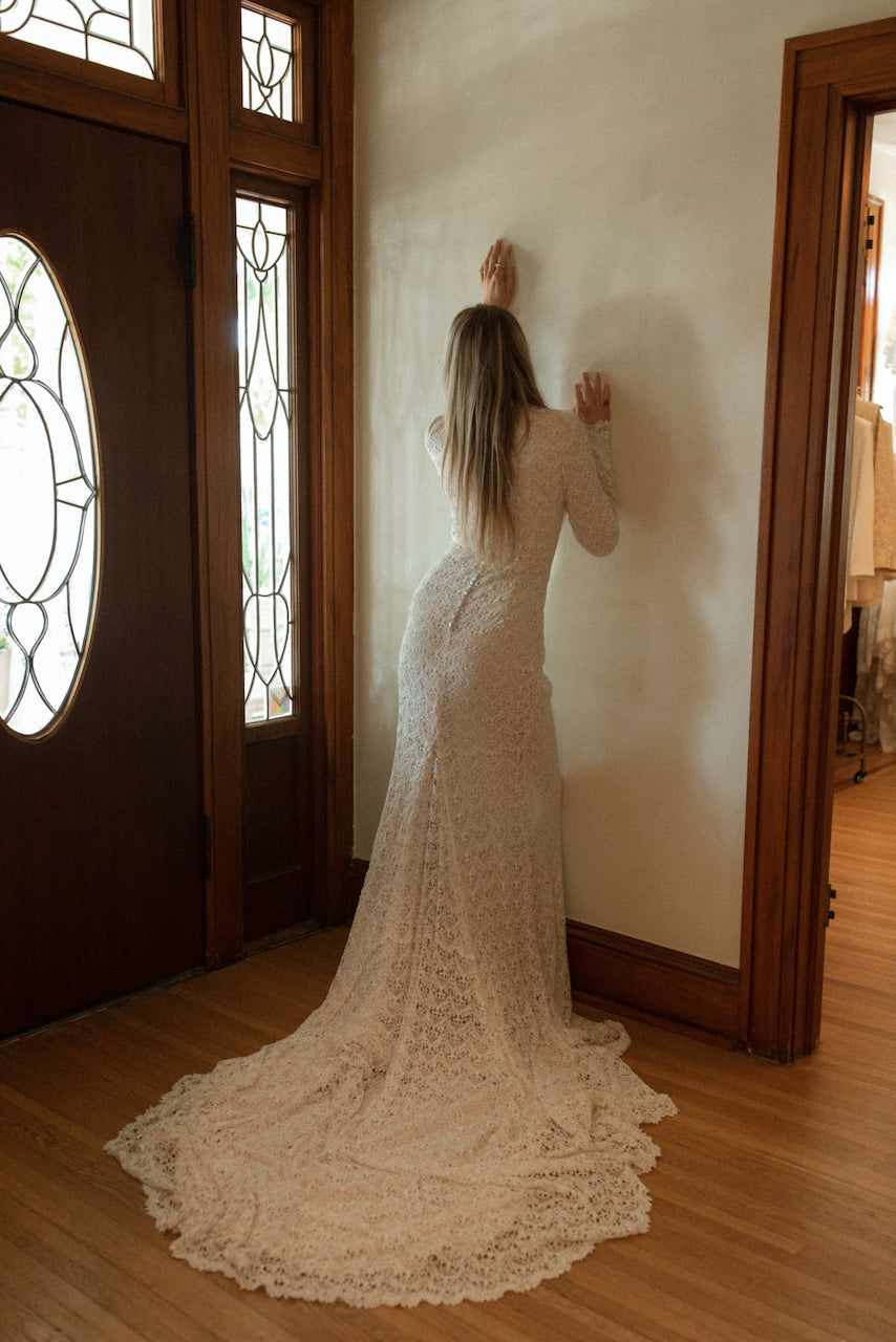 Find out where you can try on our gowns on our retailers and trunk shows pages. If there is not a retailer near you, we’d love to send you the gown to try on at home.