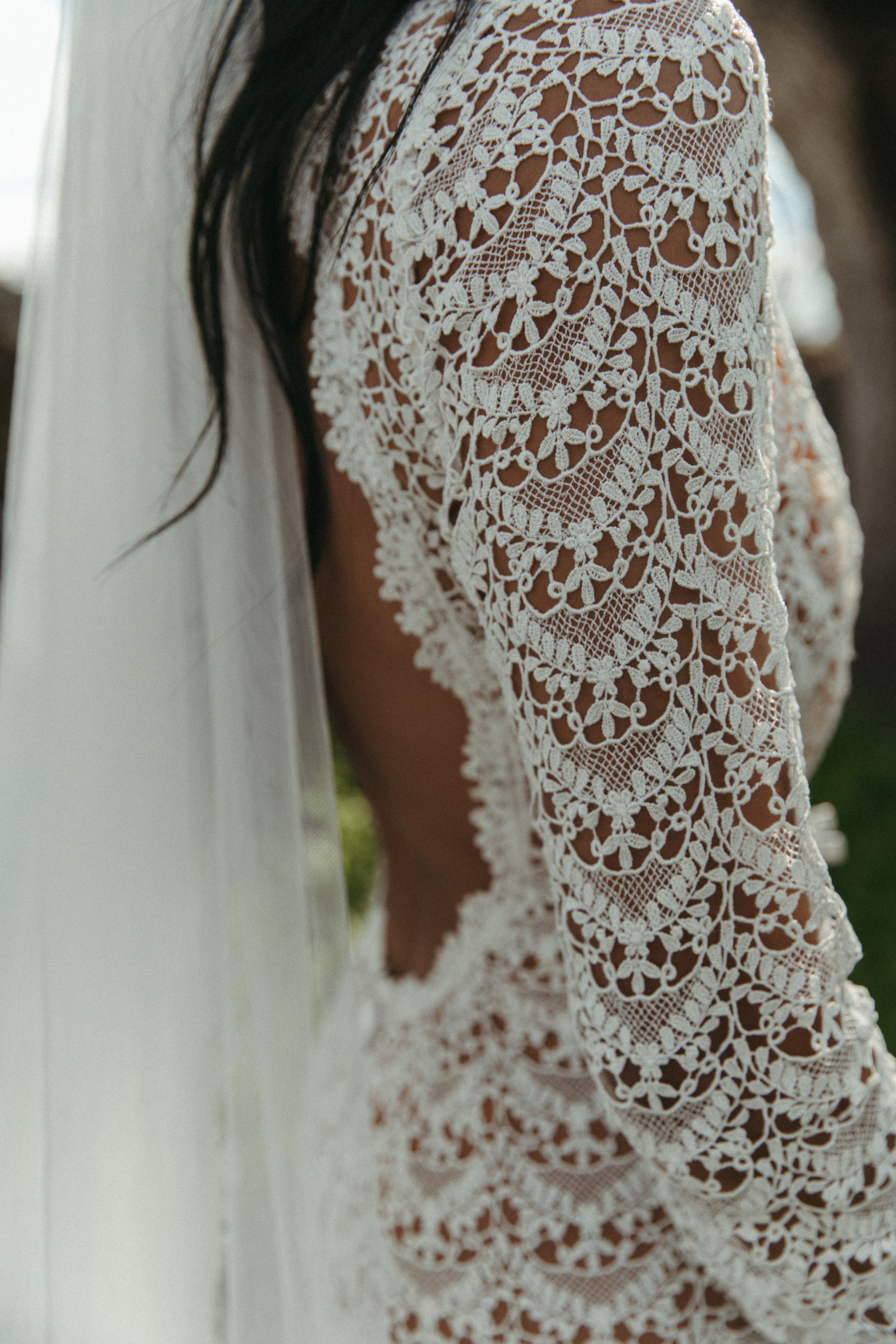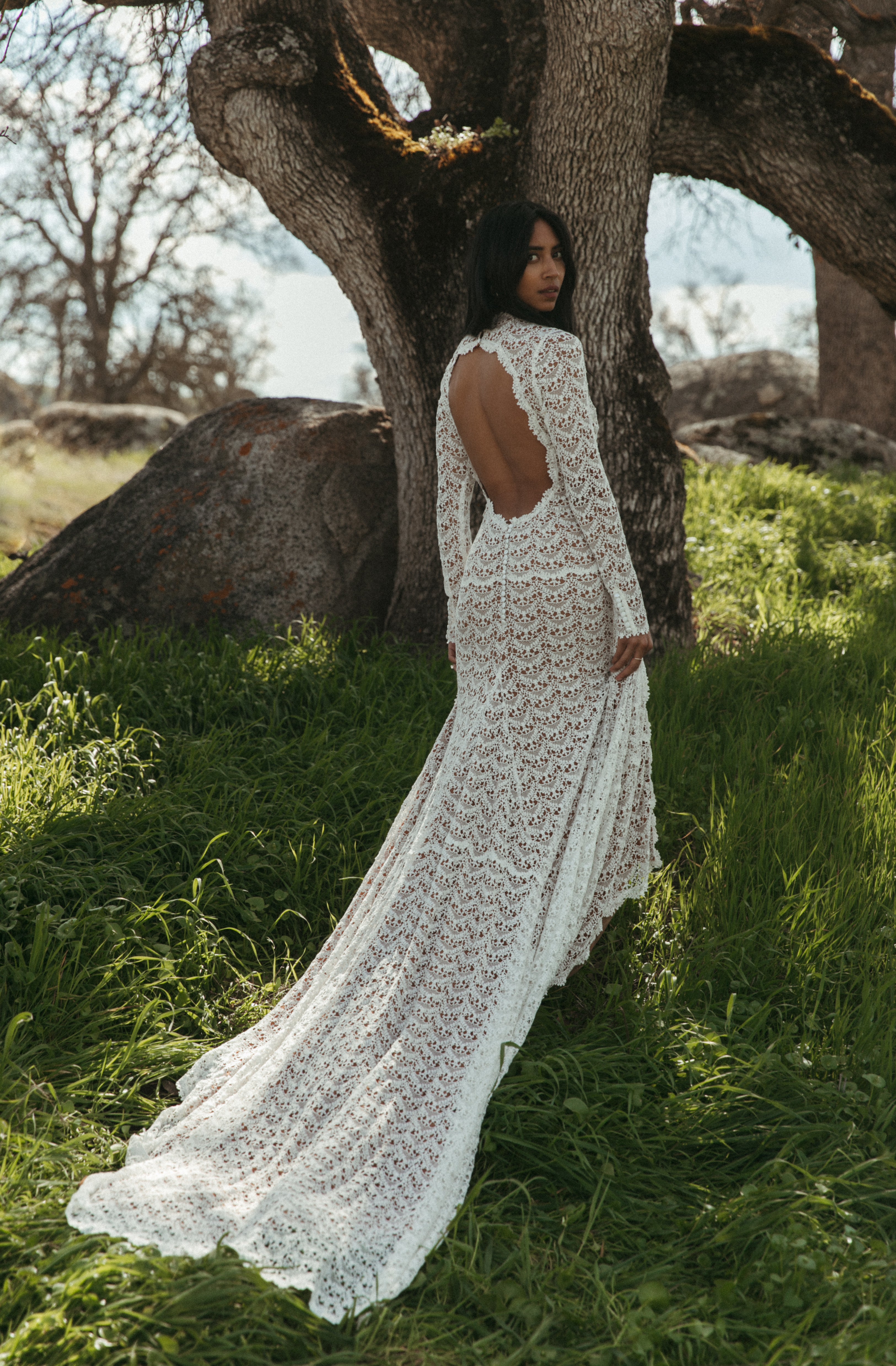 Guipure scalloped lace wedding gown. Can be made with a closed or open back. High neck, sweeping train. Liner options include skin tone, blush or ivory.